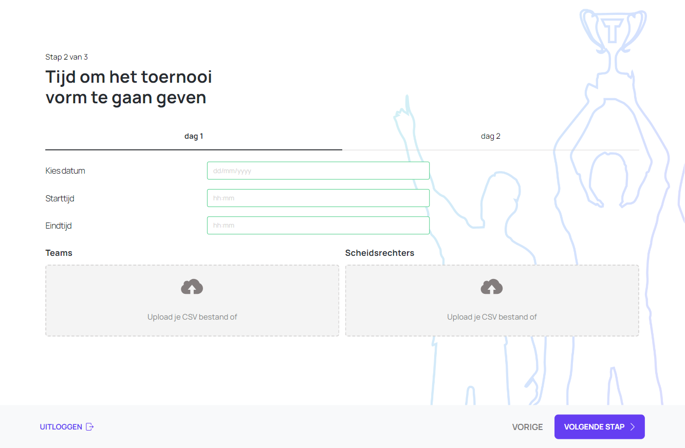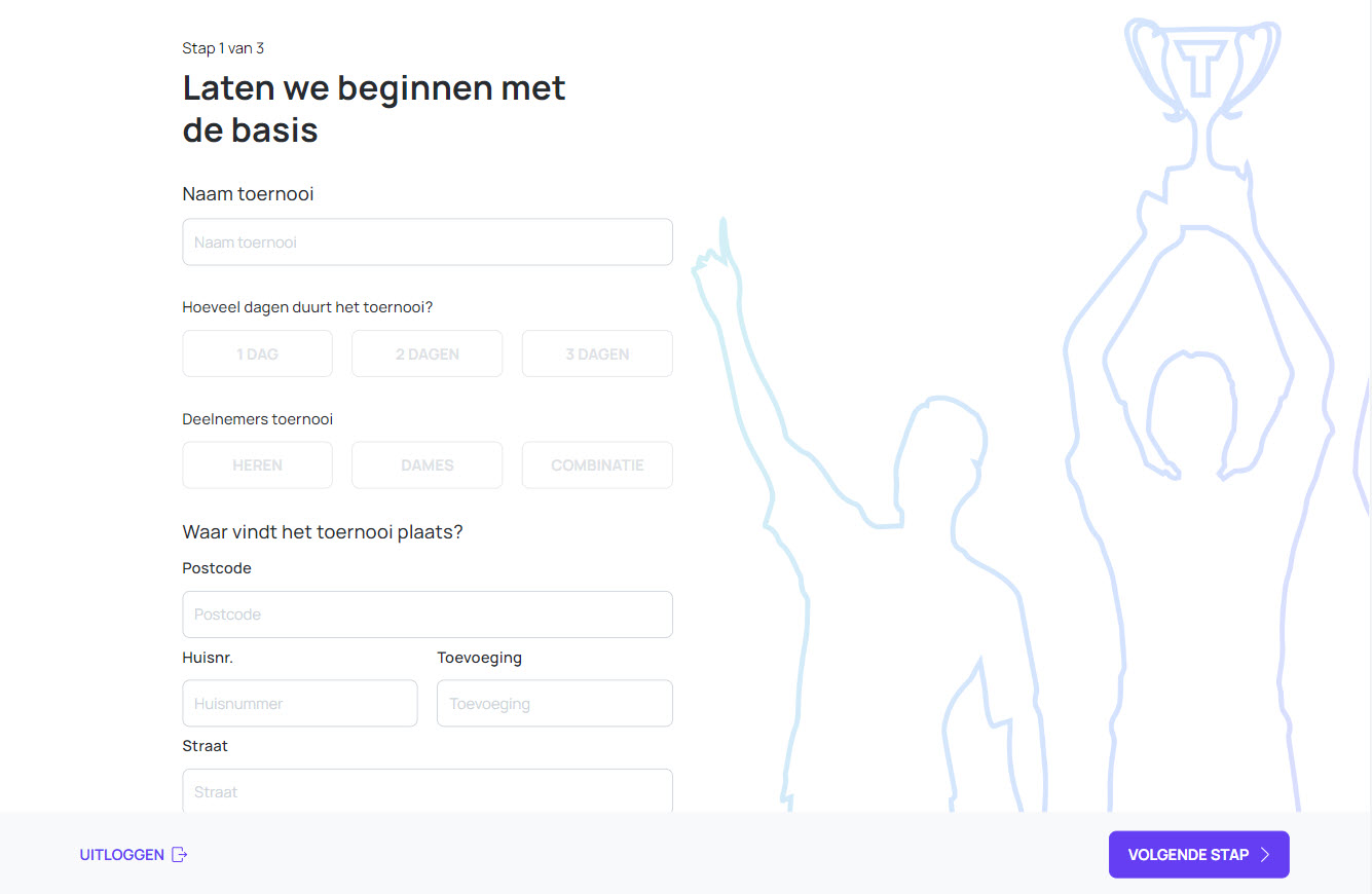 First things first, we vragen je om de naam, locatie en duur van het toernooi