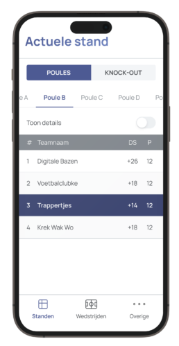 Als laatste vragen we je om het aantal teams per poule, het aantal velden, de pauzes en het verloop van het toernooi. Klaar!